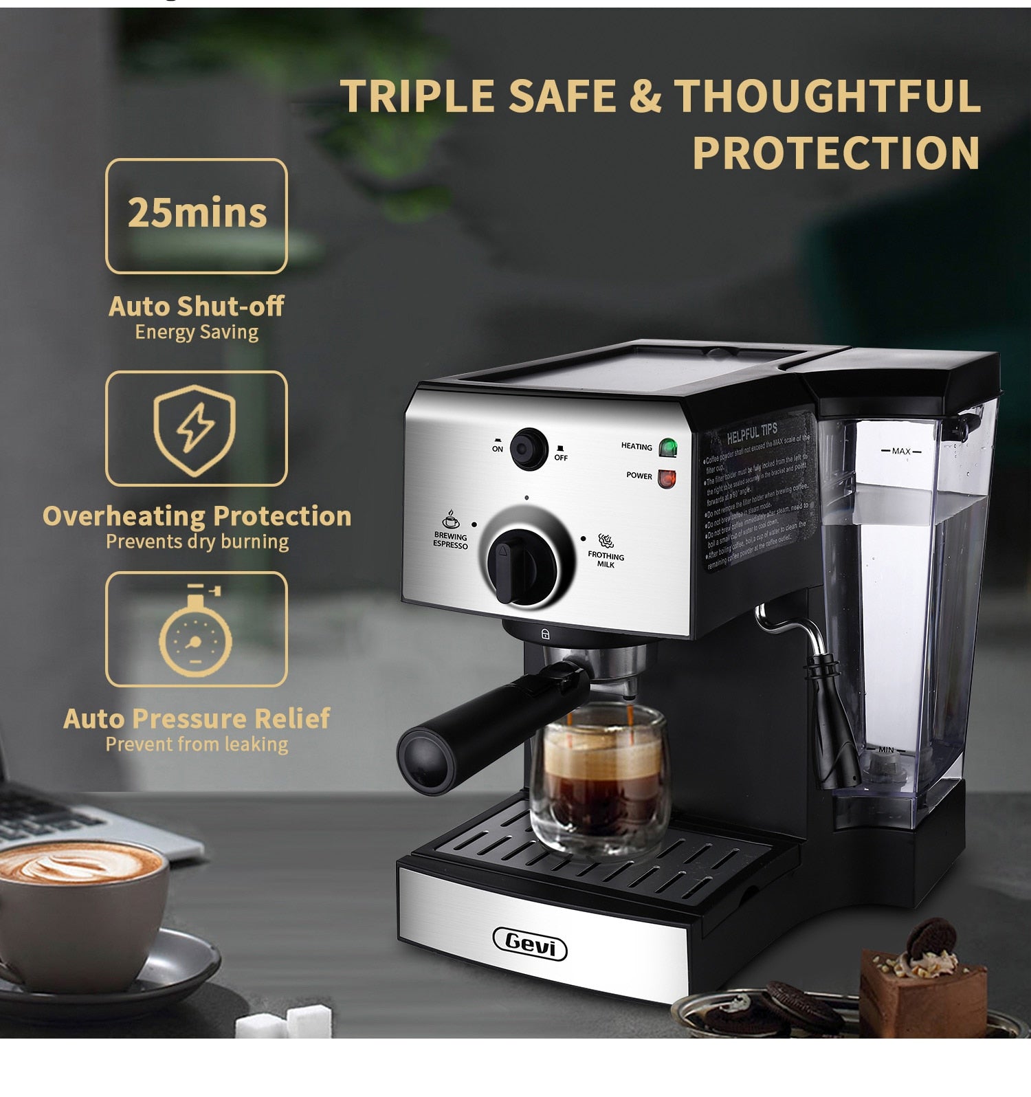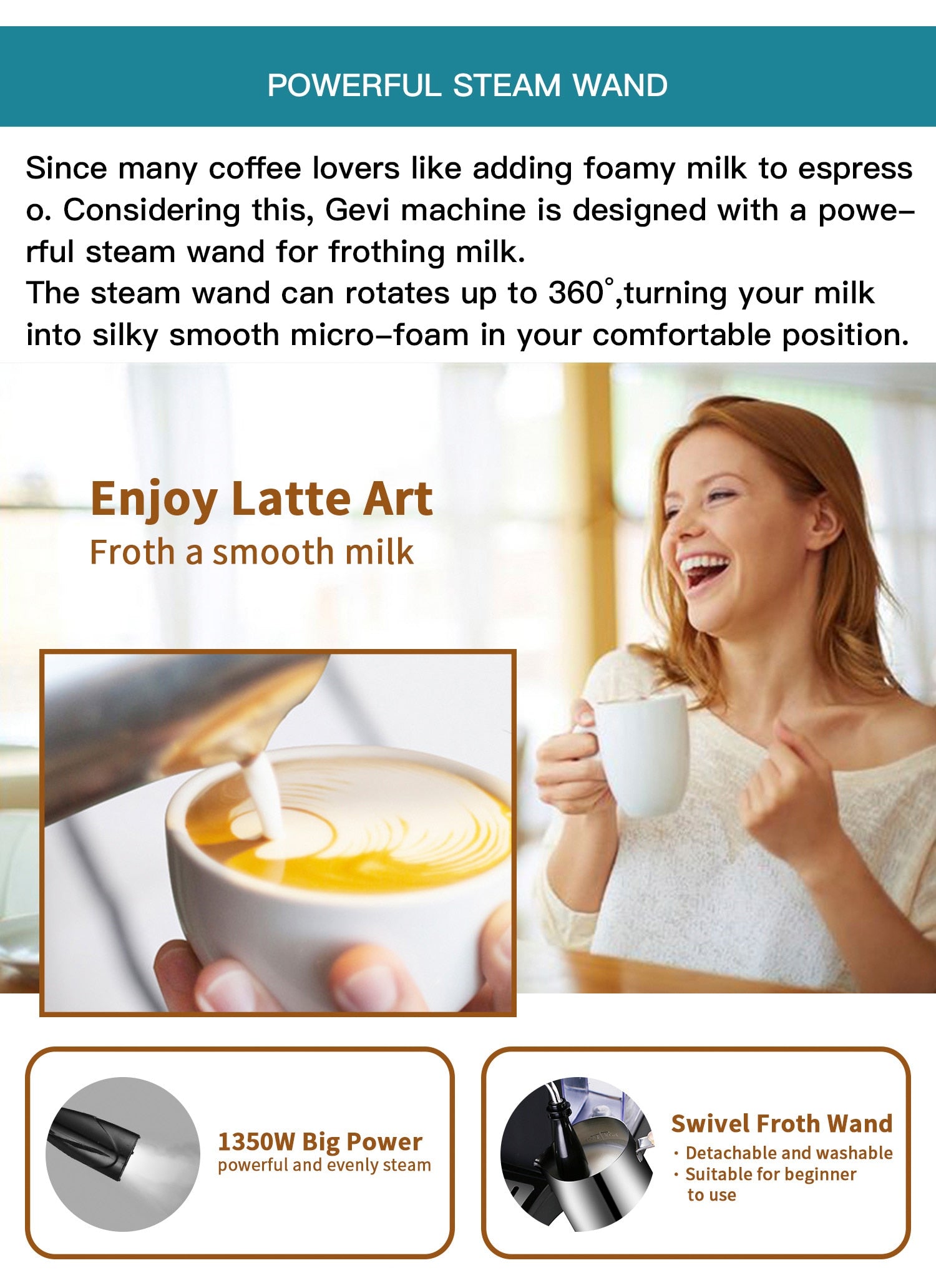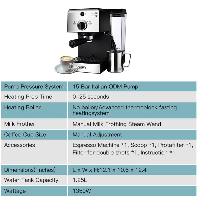 - ADVANCED THERMOBLOCK FAST HEATING SYSTEM: An espresso machine's heating system is essential. A more powerful heating system contributes to faster extraction. It uses a 1350W power system with an Italian ODM pump to achieve 2-3s espresso extraction. It only takes 45 seconds from water heating to brew completion.