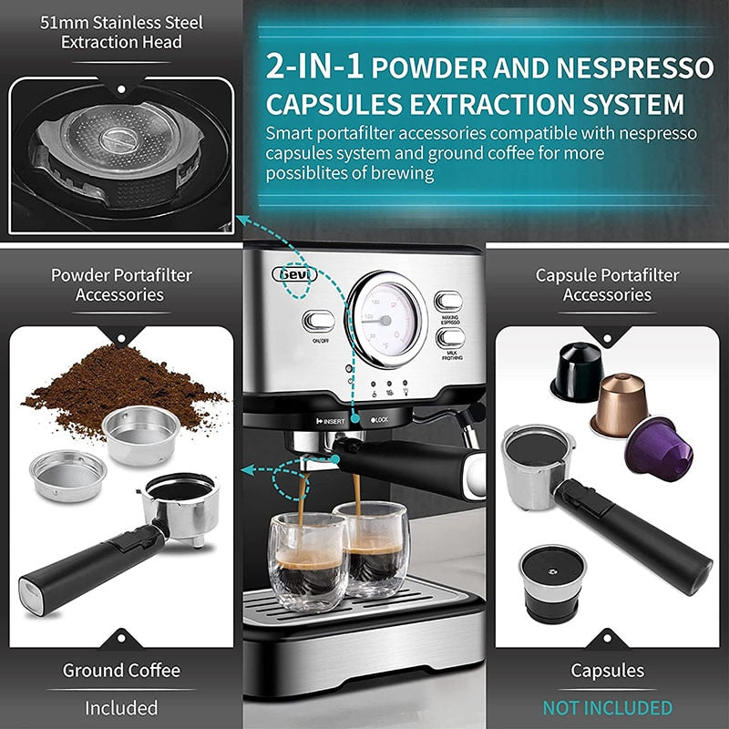 - EASY TO USE: Load the machine with your favorite coffee or espresso powder and enjoy freshly brewed coffee.